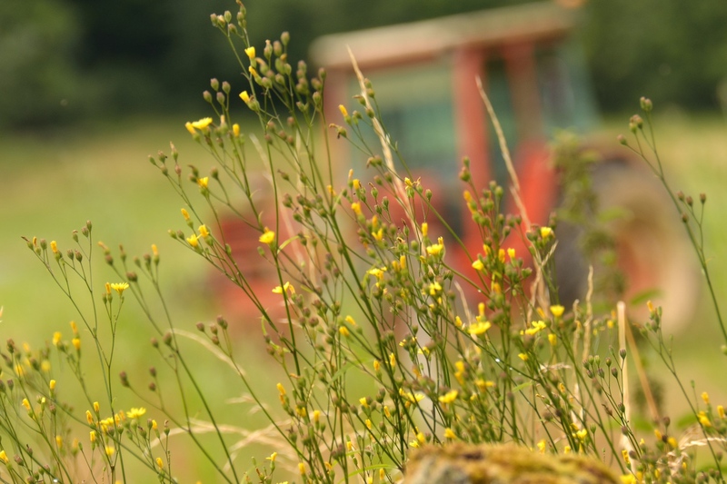photo champetre qui me plait bien parce que j'aime les champs...Couleurs chaudes qui renforcent le cote campagne agreable avec ces tons de vert de jaune exaltes bien sur par le rouge orange du tracteur...Ceci dit, le tracteur est a mes yeux trop present, coupe-colle bord cadre ce qui enferme ta photo et a mon avis trop central... Tu as en bas du cadre une espece de "pataques" jaune qui casse l'image...enfin sur mon ecran ca manque de contraste... :)
