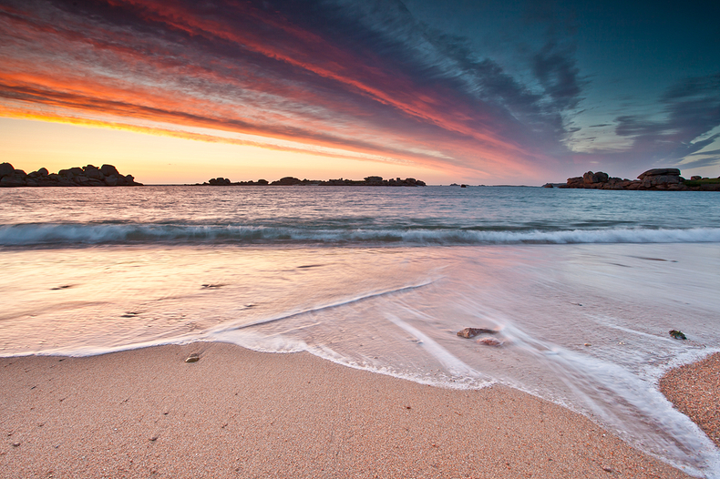 Bien dynamique ce couché de soleil : une forme de vague sur le sable qui semble répondre à la forme étirée des nuages dans le ciel...