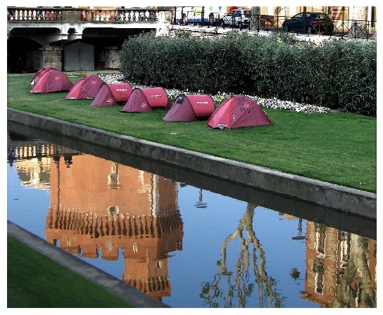 Trés bien vu, ce contraste entre les tentes et le reflet d'un chateau ! Dommage de ne pas avoir pu conserver le sommet de la tour ! Pour la netteté et la taille, tu n'utilises que 90 k environ alors que tu peux aller jusqu'à 150 k! Amts.