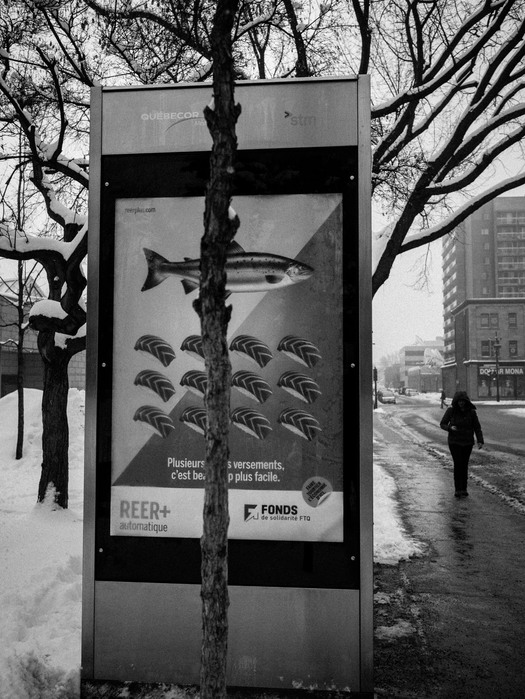 L'image coupée en deux, mais pas à l'axe avec le panneau un peu de travers donne l'impression d'une prise rapide (ce qui est p-être le cas)