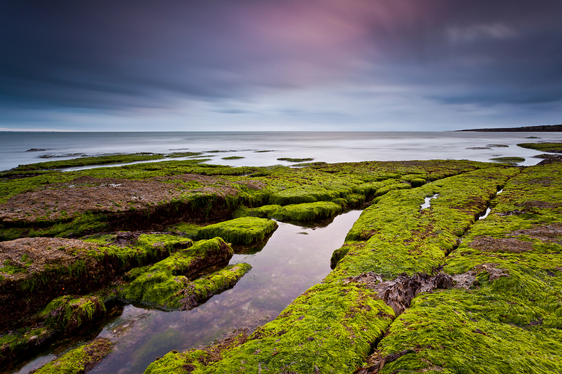 Une prairie marine où le vert est le sujet principal. Le tout agrémenté de très belles teintes dans l'eau et dans le ciel.