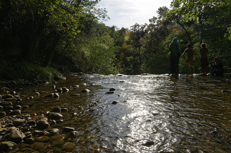 L' idée est sympa mais, Je pense que tu aurais du te reculer un peu, pour donner plus de profondeur a ta prise et ainsi prendre les deux côtés de la rive, afin qu'ils amène le regard vers la chute et tes personnages.ca les aurais ainsi miniaturisé ce qui aurais donner je pense plus de force a la nature.