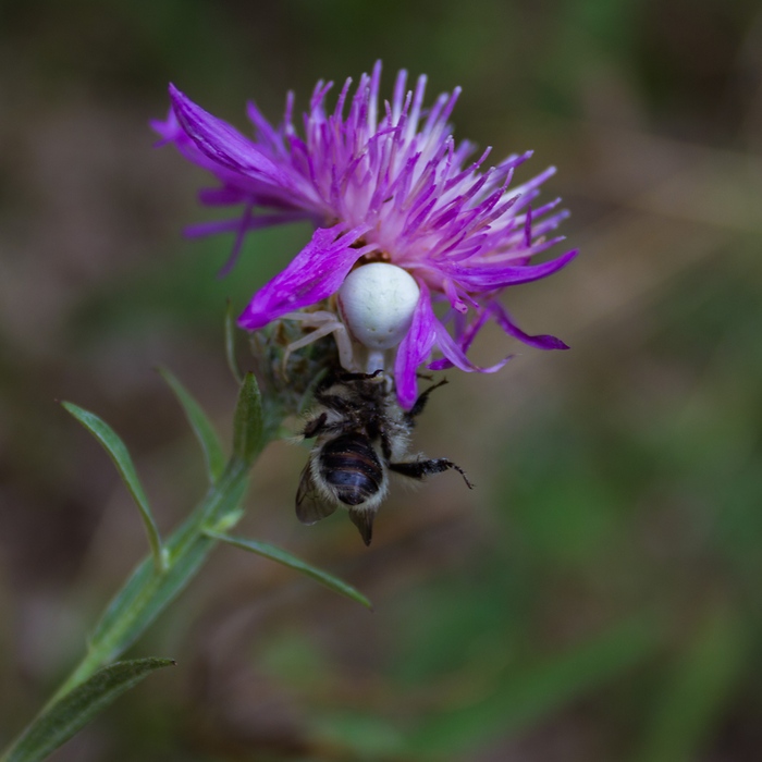 J'ai voulu raconter l'histoire de ma decouverte. En fait, ce qui a attire mon oeil lors d'une promenade, c'est de voir ce bourdon qui avait les pattes en l'air, etrangement suspendu sous la fleur. Je n'avais pas vu l'araignee (depuis, j'ai decouvert que c'est une araignee crabe).
