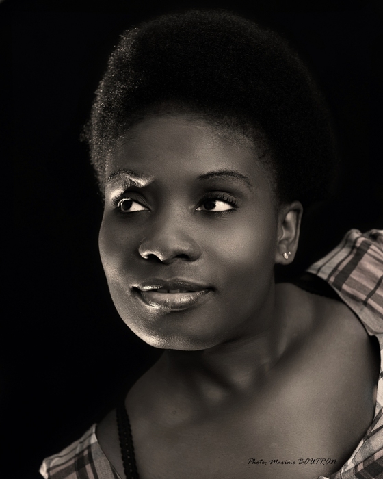 Ah ! voilà enfin un beau portrait "studio" en n&b ! n&b bien dosé, bon cadrage ( un poil trop à gauche je pense ). Là, on a une pose originale et une attitude qui fait très nature.