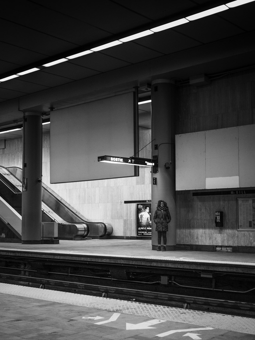 Tu saisis bien certaines situations, qui ont toutes le mérite de nous embarquer dans des histoires. La position quasi centrale, du personnage, mériterait d'être déplacée vers le bord droit permettant d'apercevoir l'escalator, entièrement, pour une bonne sortie de l'image. Était-ce possible?