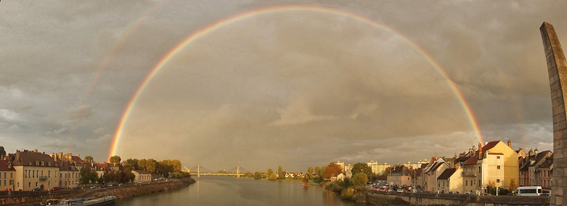 Ah, le voilà entier! C'est même un double arc en ciel, la couleur est super, je trouve juste l'"obélisque" à droite en torsion un peu étrange.
