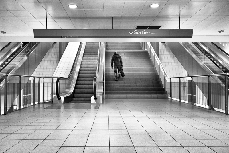 le rendu et le NB sont TOP acec toutes ces lignes qui se croisent. J'aurais préféré le personnage à une autre endroit (pas au centre mais où?)