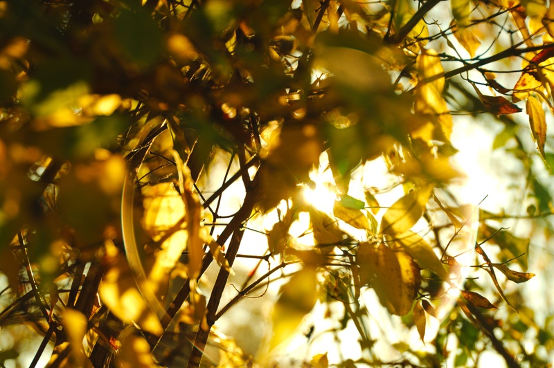 Soleil couchant au travers des dernières feuilles de l'automne...