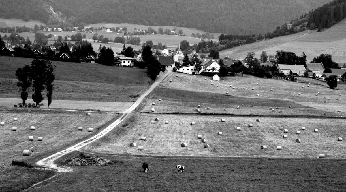 Comme 2 photos en une. Un premier plan (2/3 de la photo) avec un noir et blanc très contrasté, ce chemin qui nous amène au village et un second plan avec un noir et blanc plus doux qui nous fait découvrir le reste du paysage. Pourquoi pas même si je n'accroche pas totalement.