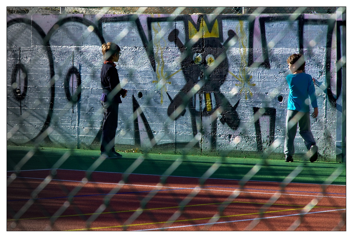 La présence du grillage est probablement souhaitée. Toutefois, je trouve qu'elle gêne un peu la lecture même si le grillage est sensé matérialiser l'espace clos. Ne pas avoir fait coïncider le haut du mur avec le haut du cadrage relève du même esprit