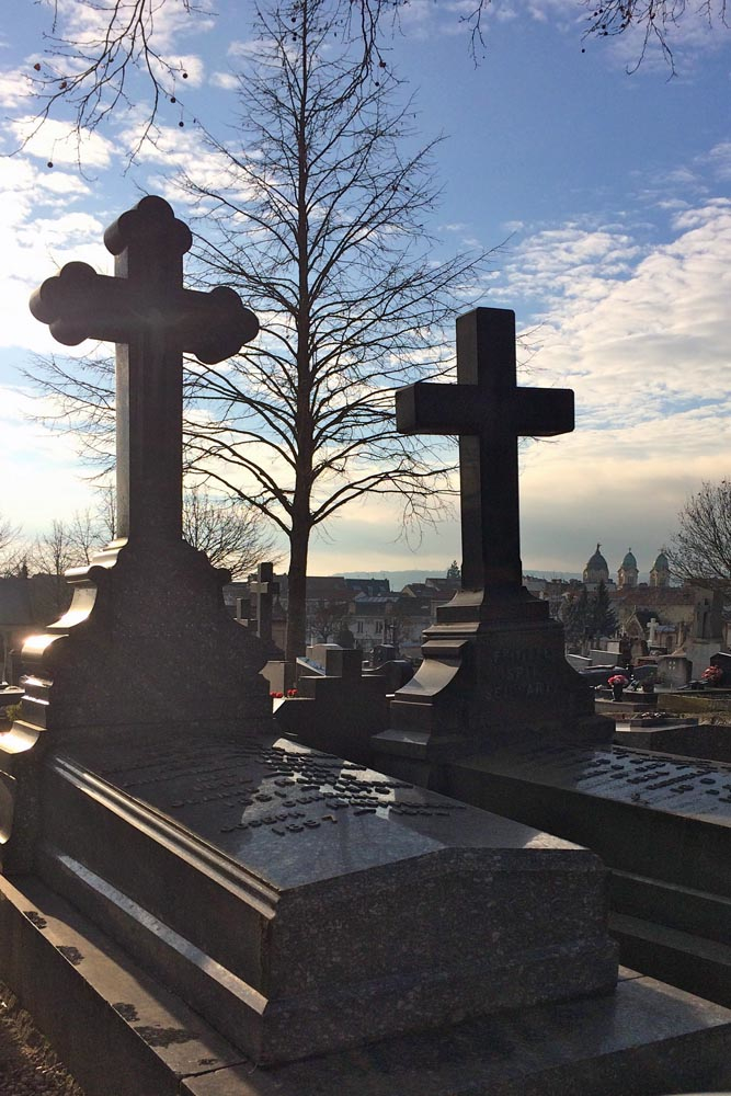 Cimetière de Préville avec les tours du Sacré Cœur en arrière-plan.
