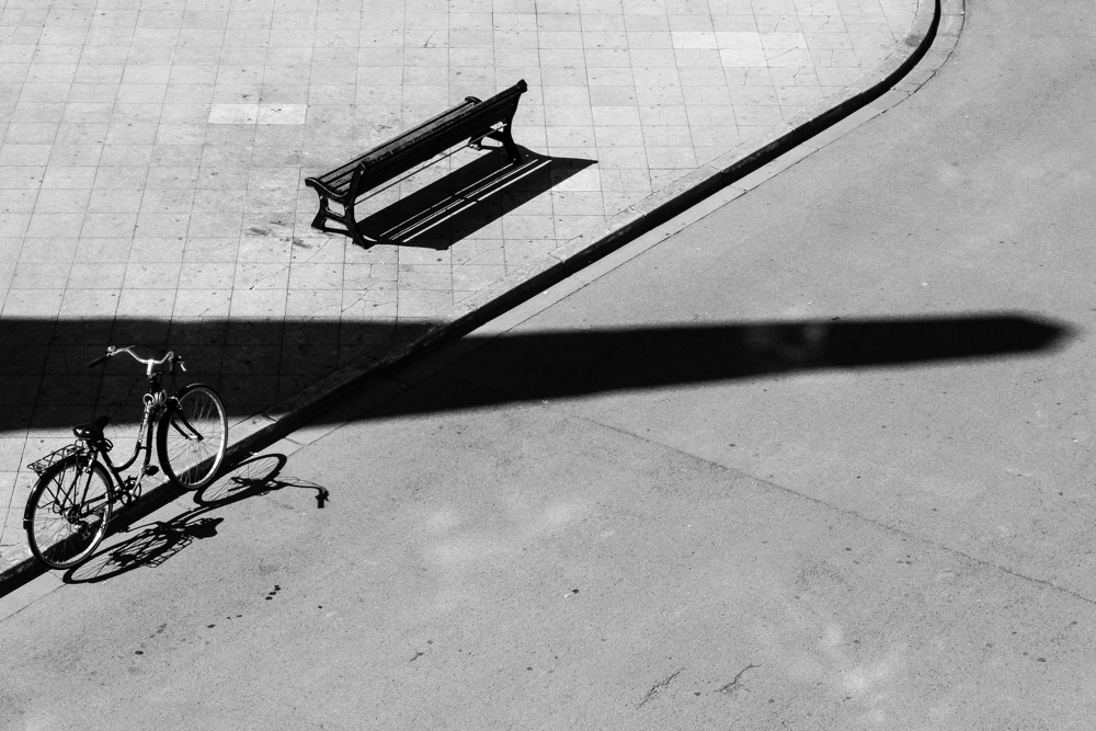 On peut imaginer beaucoup d'histoires avec cette photo ! Un banc et un vélo, pas de personnage, une ombre menaçante ! Concernant l'aspect technique je ne suis pas compétente pour donner une critique.