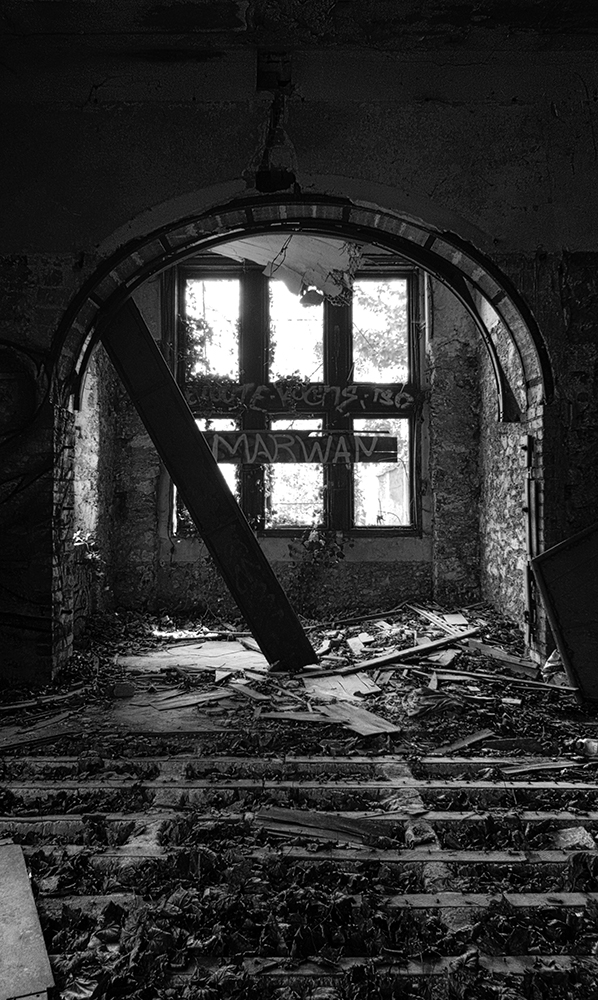 Pas spécialiste du genre, mais j'accroche bien, j'aime bien le N&B, et la compo me mène jusqu’à ce bout de plafond effondré qui m’évoque un visage a lunettes et sinon, j'y couperais bien une bande du haut