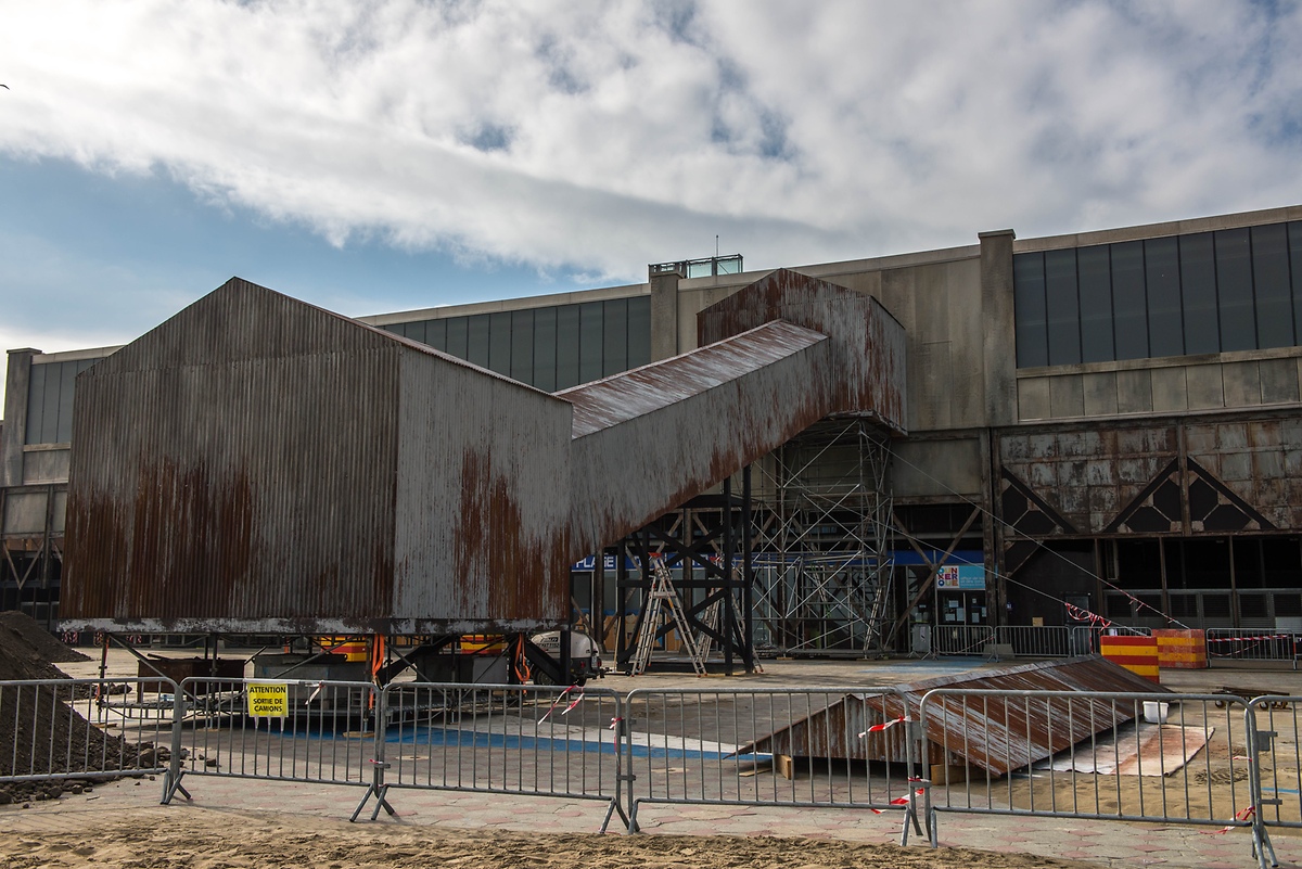 Le palais des congrès sur la digue de Dunkerque en complete métamorphose pour les besoins du film, ainsi que plusieurs façades et rues.