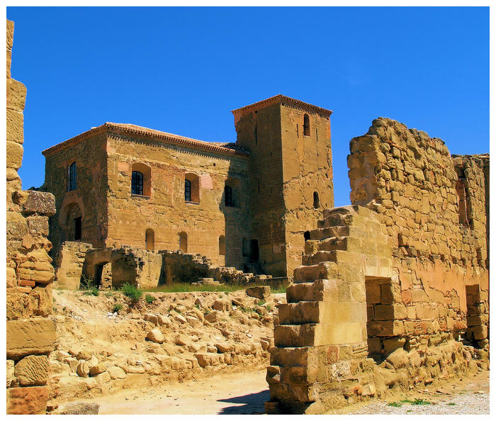 Ici à quelques kilométres ,le début du désert et cette forteresse de MonteAragon du XV ou XVI siecle qui tient debout (encore et en partis restaurée) hantée par le cris des choucas et l'ombre des ailes des vautours fauves sous un soleil de plomb...on y tourne des westerns...??!!!