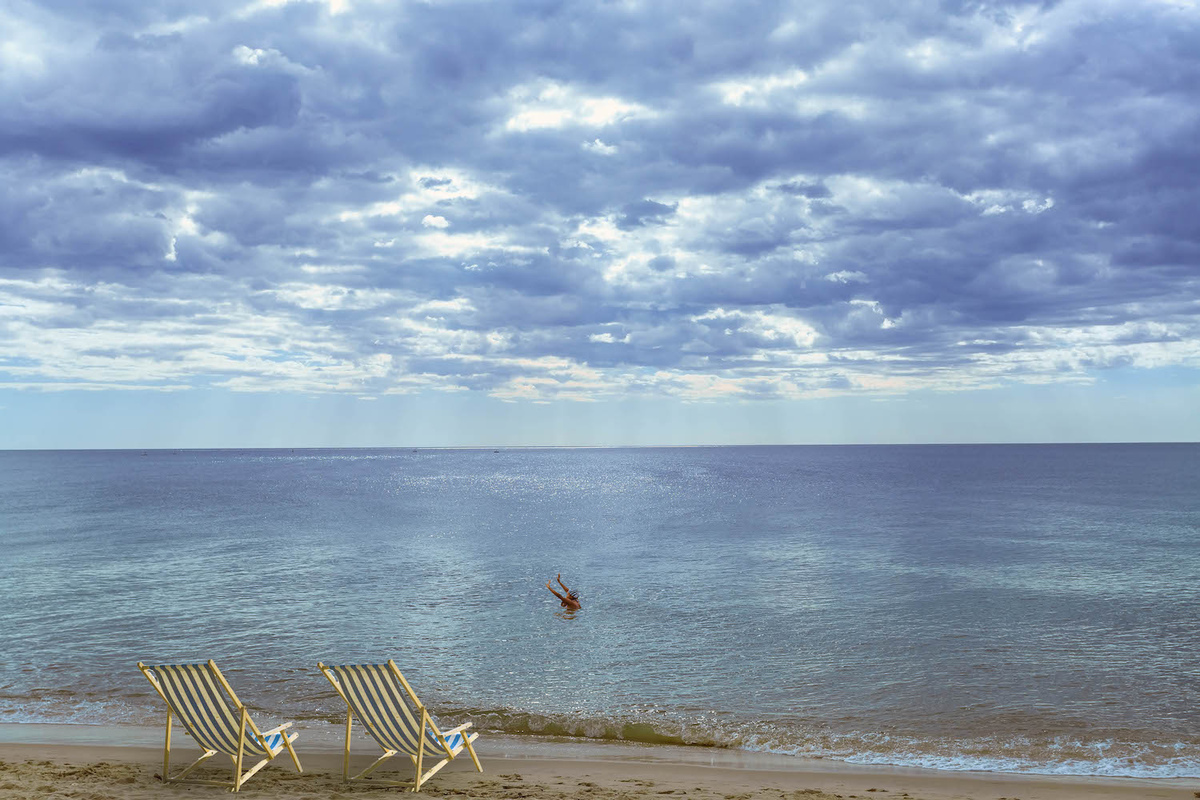 En générale il est mieux d'éviter l'horizon au milieu = 50/50 et aussi de placer un des éléments important ici le baigneur aussi au milieu il existe une loi dite la loi des 1/3 qu'il faut connaître afin de se poser la question quand on y déroge si l'on peut le justifier.