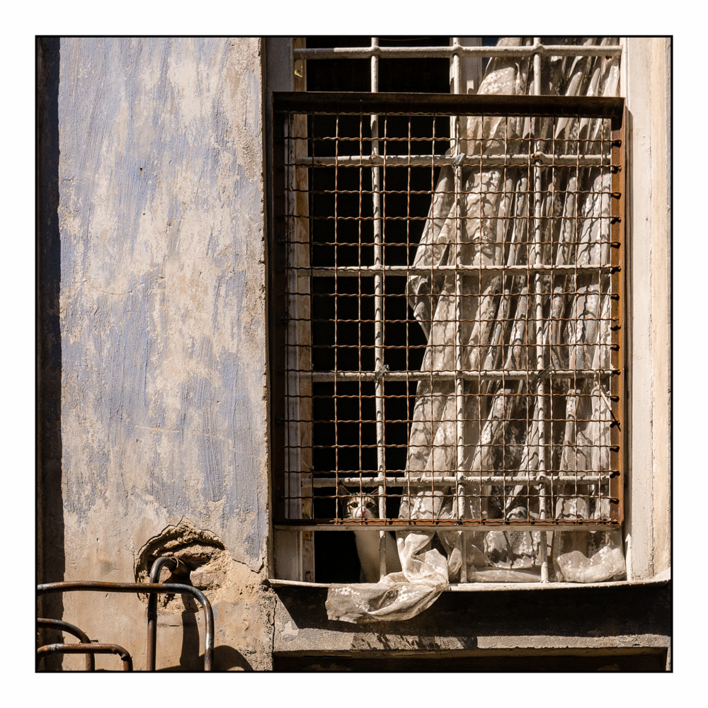 L'image est fort bien construite, bien réalisée, la colorimétrie bien dosée. C'est plein d'esprit, le grillage sur la grille, les tuyaux à G qui rappellent les grilles, le chat placé subtilement, le drapé, la patine du mur etc...