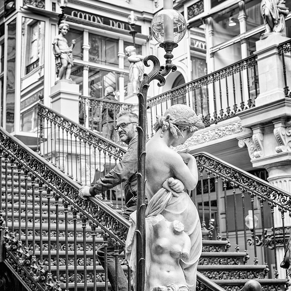 Trop lumineux ce qui fait perdre du détail, mais la compo est excellente: l'homme, le statue, le lampadaire et l'escalier pour sortir.