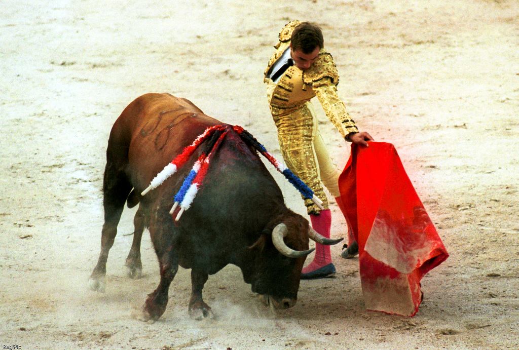 c'est une photo dynamique, prise au bon moment je pense, avec une belle attitude des deux protagonistes. elle est un peu trop serrée, bord cadre, et le sol trop blanc par endroit; dommage qu'on n'est pas plus d'infos sur la tête du taureau, son œil, je pense que c'est rattrapable.