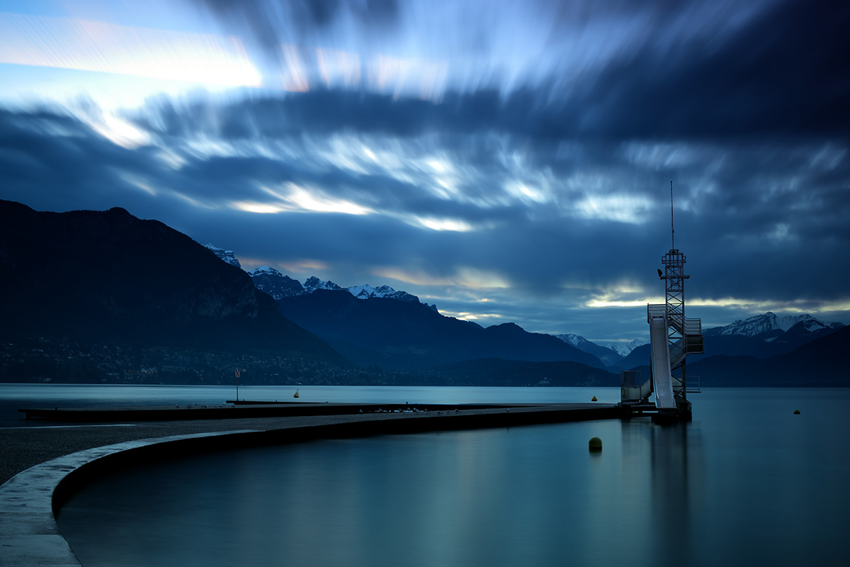 Une prise de vue plus beaucoup plus à droite sur grande pelouse, aurait permis de mieux voir la Tournette enneigée, ou beaucoup plus à gauche vers le petit port, pour voir la perspective du lac, avec le Semnoz, en gardant le plongeoir si on y tient à gauche.