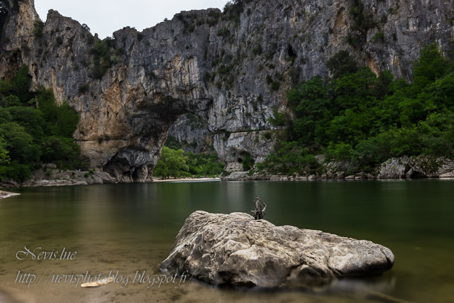 le pont n'est pas assez mis en valeur. Différentes choses attirent le regard. La bande floue tout en bas, la signature un peu longue, et la pierre, et surtout ce qu'il y a dessus! on dirait un personnage. Si c'est le cas pourquoi ne pas recadrer en enlevant le ciel et en resserrant plus sur l'arche, la roche et le personnage, les 3 éléments de la compo.