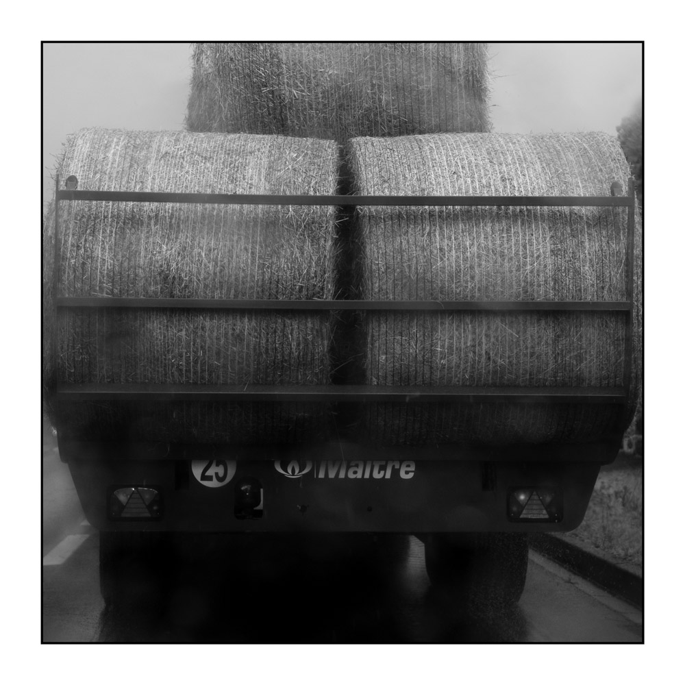 Il attendait une accalmie pour rentrer le foin et comme elle ne venait pas, le paysan malin n'en pouvant plus, est parti bravement sous la pluie pour rentrer ces ballots que ses vaches dégusteront avec plaisir avant de ruminer longuement dans la pénombre. C'est le Maître de l'étable.