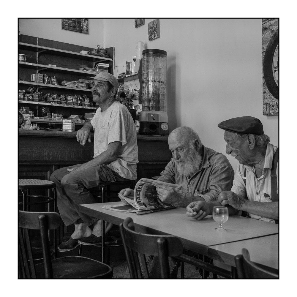 Tu les as magnifiquement mis en boîte. Le geste de l'homme de droite donne le signe de vie significatif d'autant plus qu'il accompagne son sourire presque moqueur. Et puis comme le souligne Deniz, il y a ce magazine qui occupe leur attention. Quant au 3eme perché sur son tabouret, il semble en pleine interrogation sur ce que sera sa journée .