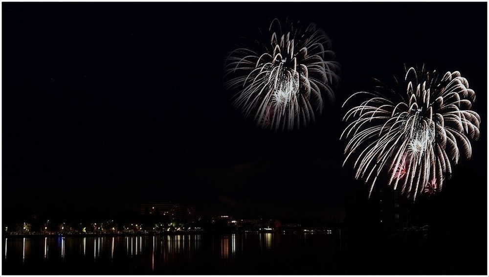 en général il n'y a pas trop de lumière lors d'un feu d'artifice j'aime bien ce cadrage qui laisse deviner les lumières qui se reflètent dans l'eau