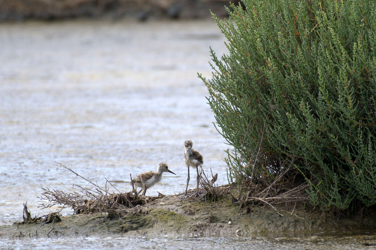 Juvéniles d'échasse blanche. Bel instant capturé. Pas facile de faire plus large pour donner une idée du gabarit, car ils seraient trop petits. L'adulte fait entre 35 et 40 cm de long.