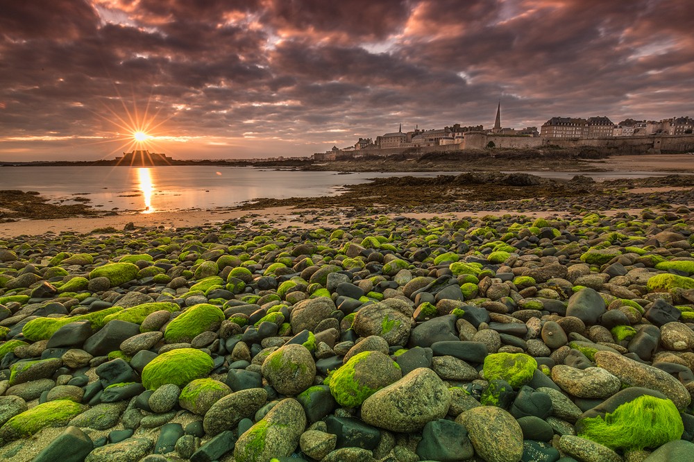 St Malo et le grand Bé je pense. Les bâtiments mériteraient d'être redressés. Un petit halo le long du clocher de droite. À part ca je trouve ça très beau.