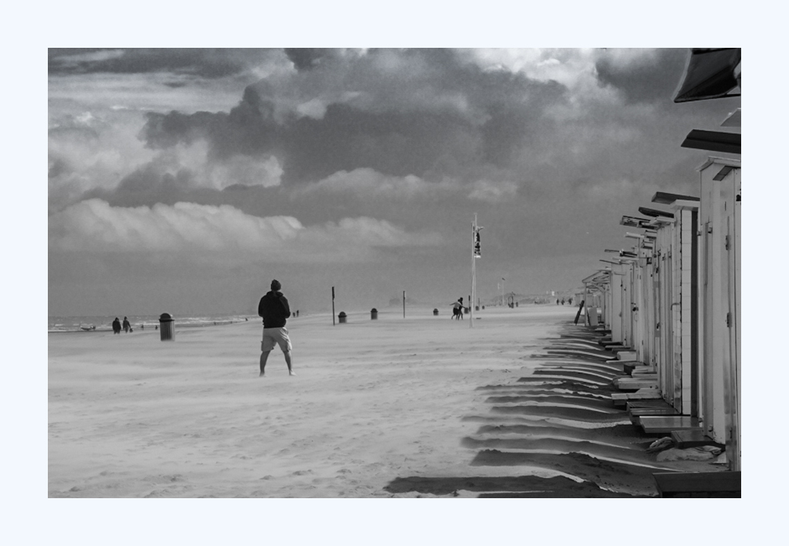 Une belle ambiance venteuse, bien retranscrite. J'aime aussi l'opposition entre la posture très ancrée de l'homme au premier plan, et le quasi "twist" de la dame au fond sur la droite (dommage qu'elle se confonde avec une 2ème personne, mais se sont les aléas du direct).