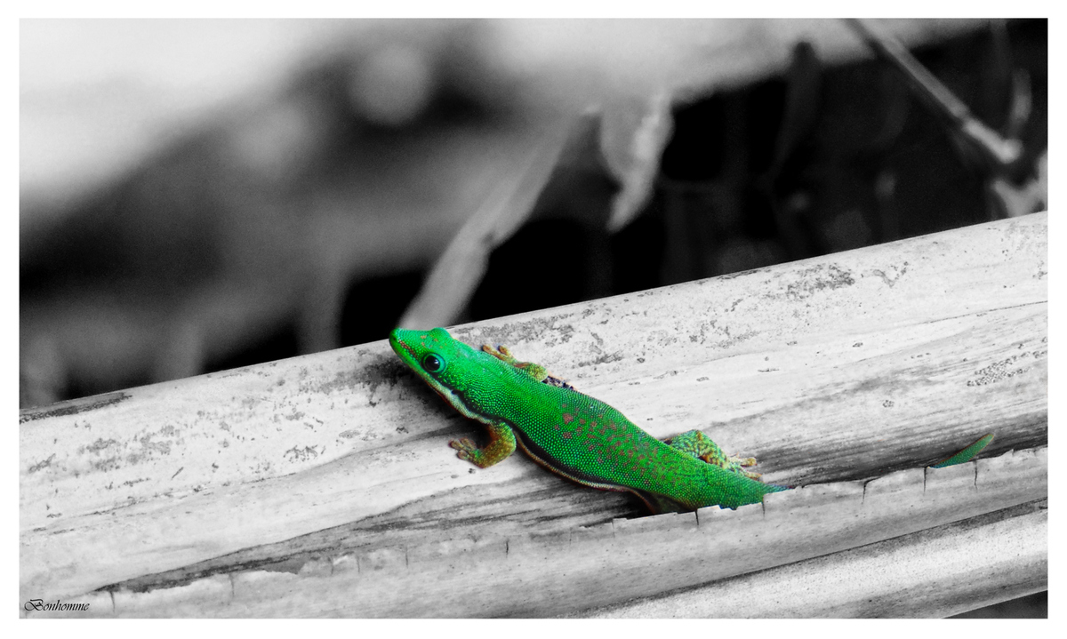 Le lézard semble sursaturé dans ce décor N/B, et parait presque irréel.