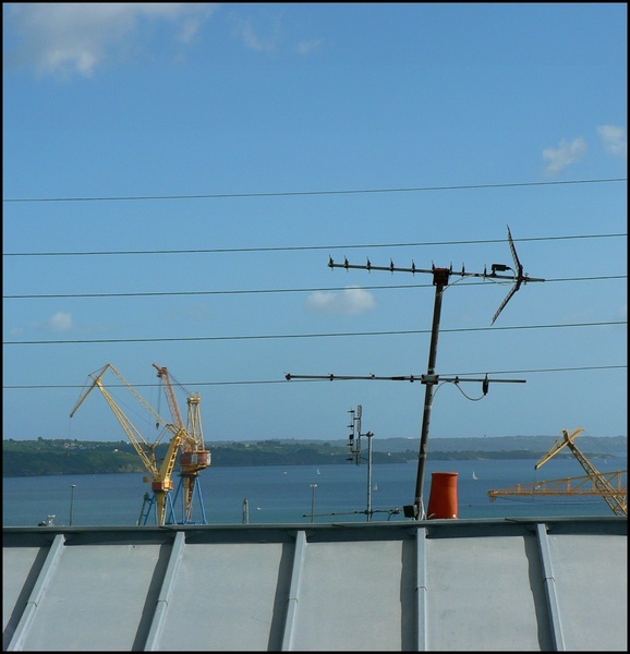 ces petites grues m'amusent aussi surtout celle qui regarde l'autre, on a l'impression qu'elle cause ..(quelle vie trépidante dans la rade) mais je crois que je trouve la partie du toit en premier plan un peu trop imposante....