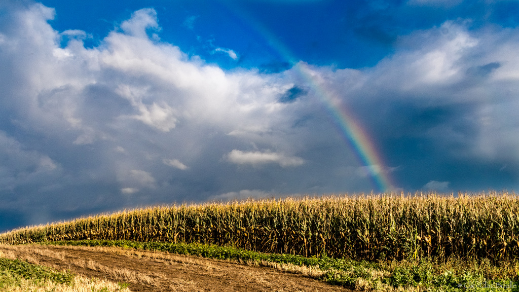 Le maïs fait un peu barrière et empêche d'entrer dans ce paysage. On aurait peut être aimé en voir plus. Mais on ne choisi pas le moment de l'arc en ciel. Je l'aurais faite aussi mais elle m'aurait déçu