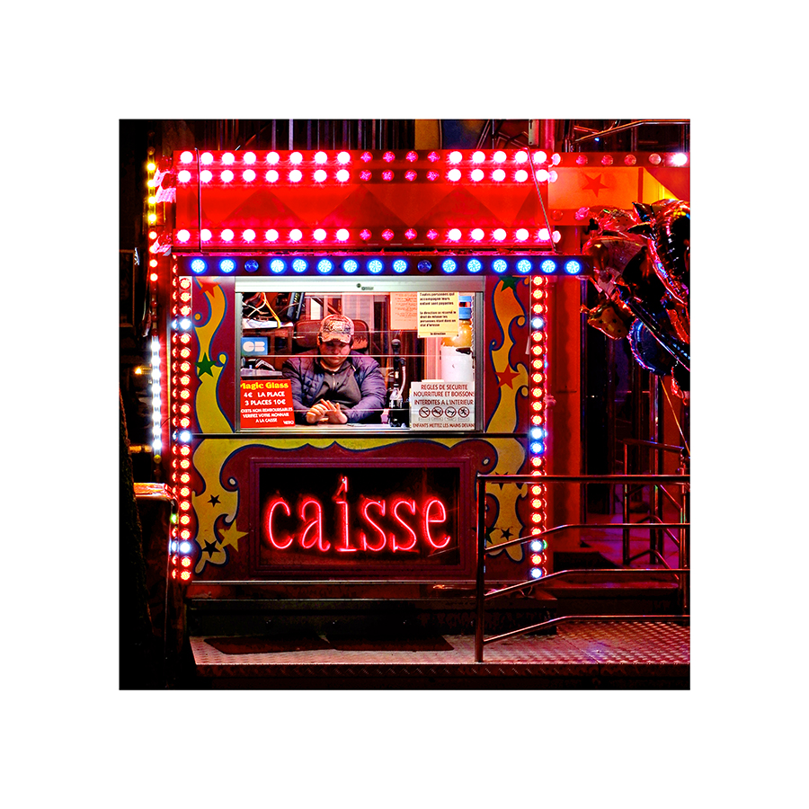 la foire et ses orgies lumineuses tant ça clignote de partout bien rendu dans ta photo le caissier calé haut sur son siège attend le client