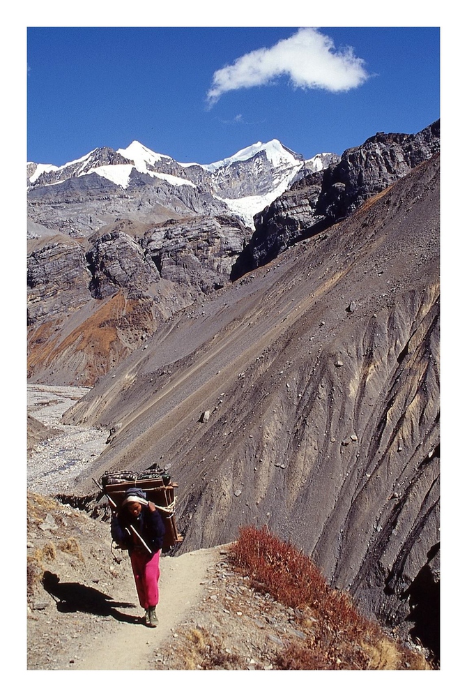 Un Sherpa? ou un habitant de la région '' le paysage est lunaire et présume de la difficulté d'atteindre les hauts sommets..