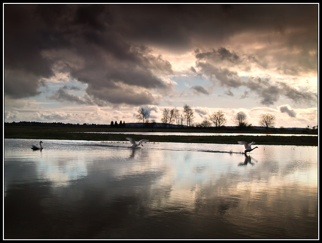 Une petit décollage de deux cygnes, devant le regard passif d'un troisième.