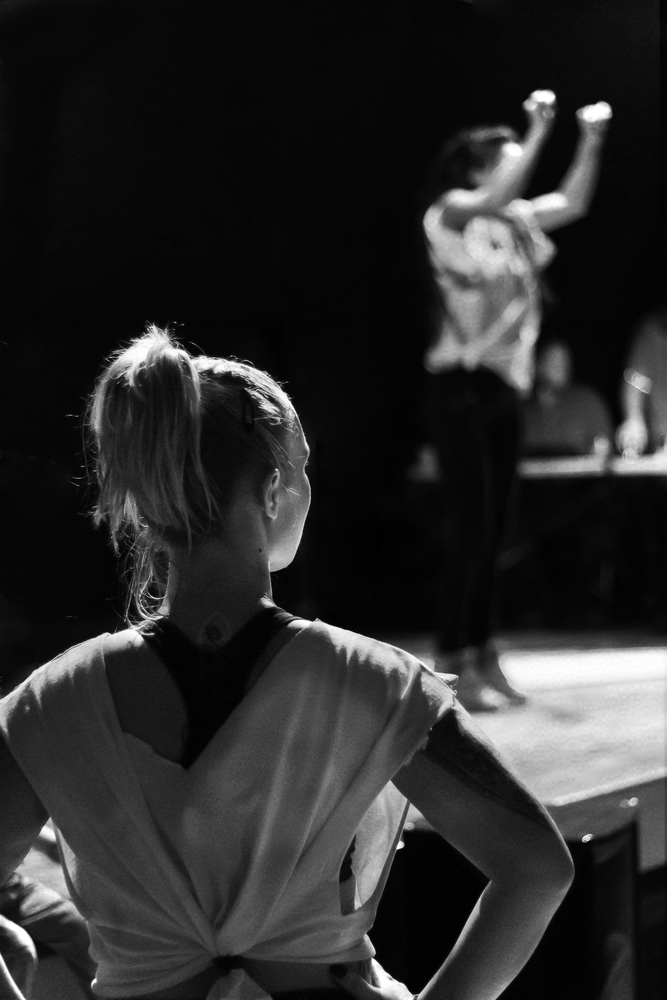 Je ne maîtrise pas la photo de spectacle mais je trouve que tu t'es bien sorti de l'éclairage souvent changeant dans ces endroits. La silhouette de la jeune femme se détache bien et ton arrière-plan assez flou. Pour le cadrage, tu te corriges. Le N&B lui va très bien.