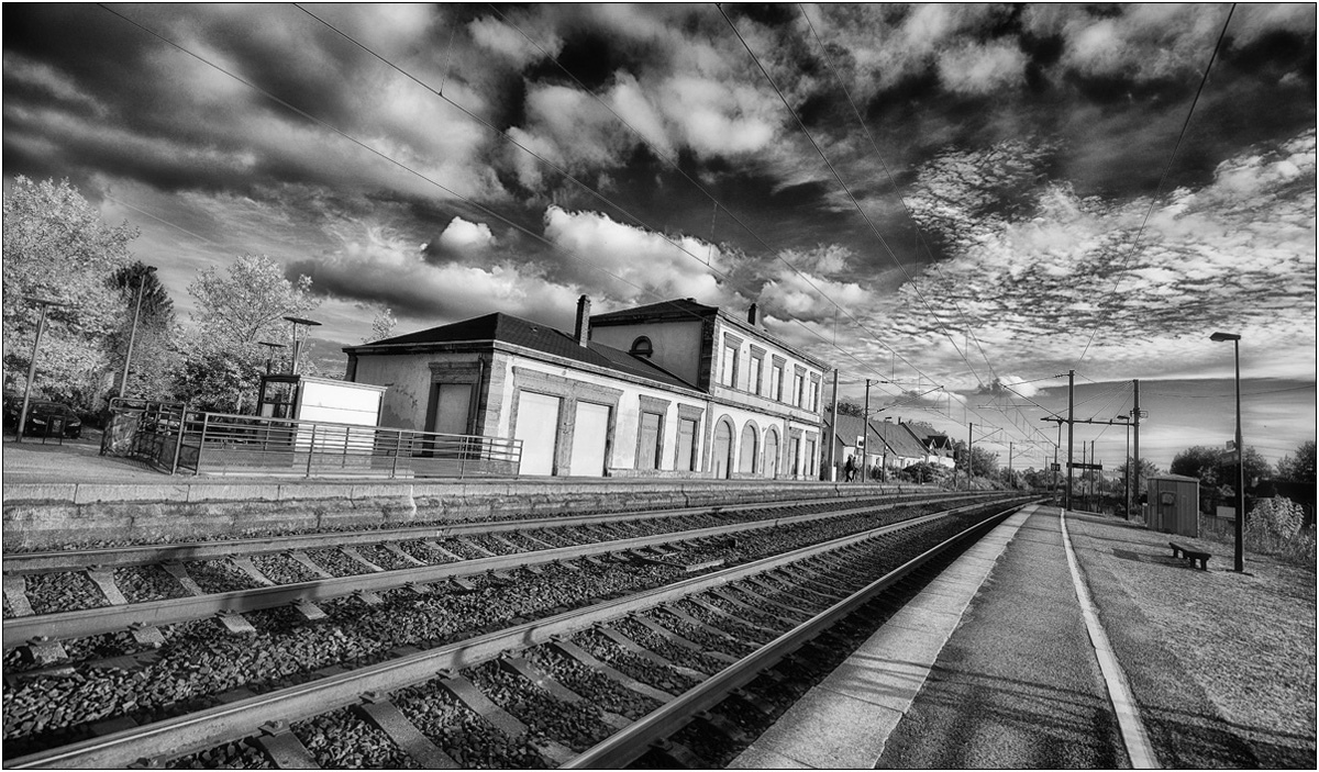 pas de cheval mais une voie ferrée j'aime bien profondeur de l'image apportée par les lignes. L'horizon penchée, le NB et le quai vide donnent un effet presque angoissant...