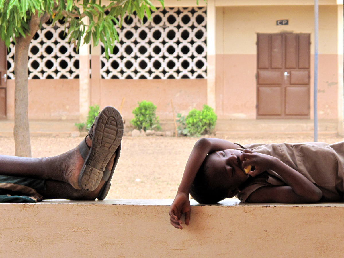 La chaleur climatique transparaît au travers des couleurs chaudes et des postures des enfants écrasés par la chaleur. J’aime la composition du cliché avec ses horizontales et ses verticales coupées par les perpendiculaires formées par les pieds de l’un et l’avant bras de l’autre