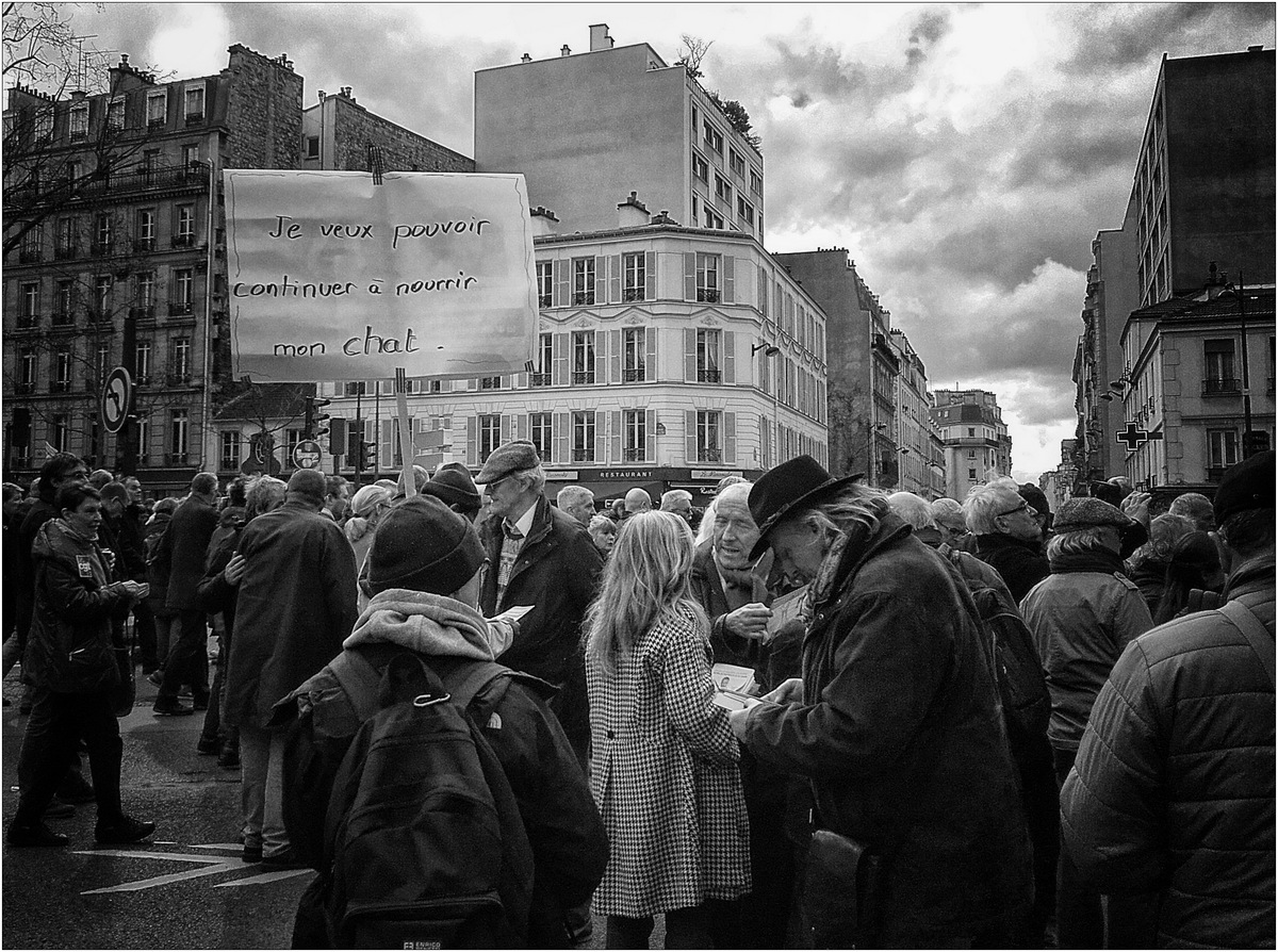 j'aime beaucoup cette photo, l'humour (pour masquer l'inquiétude ?) de cette seule pancarte au dessus des têtes des manifestants