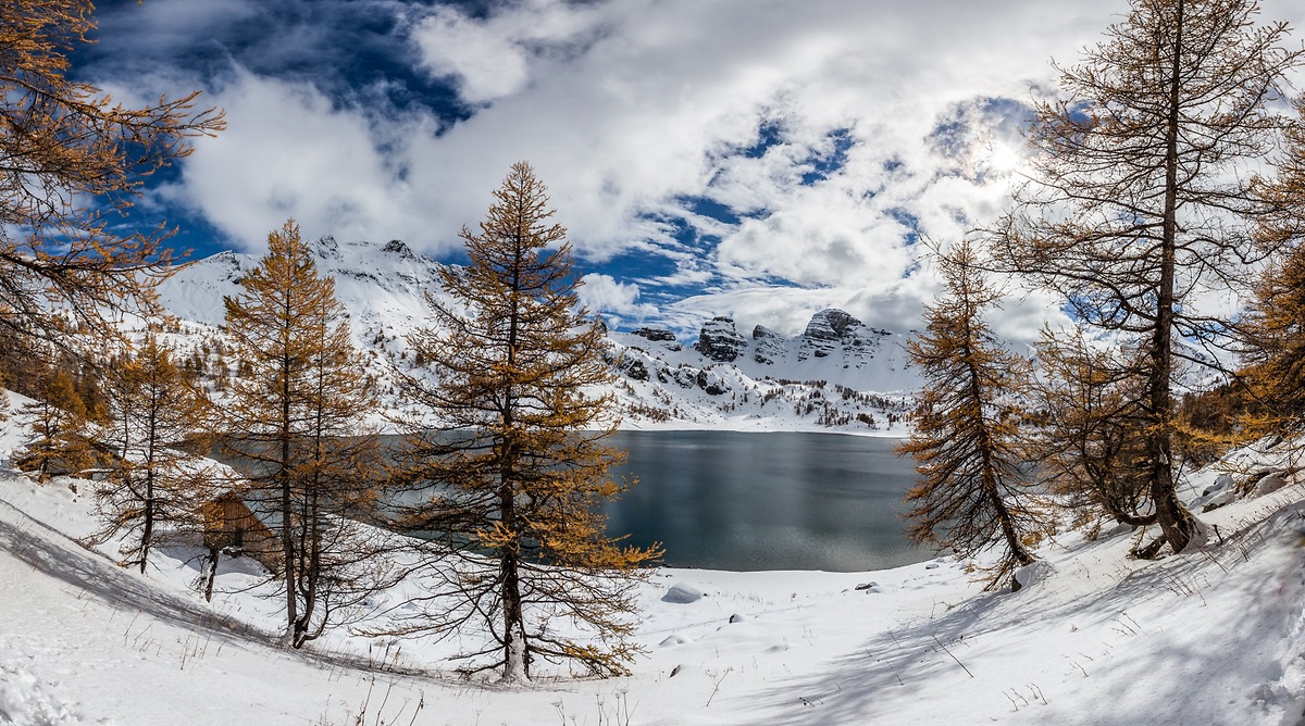Un panneau de 7 photos (avec beaucoup de recouvrement) du lac d'Allos (04) pour une rencontre de l'automne et de l'hiver