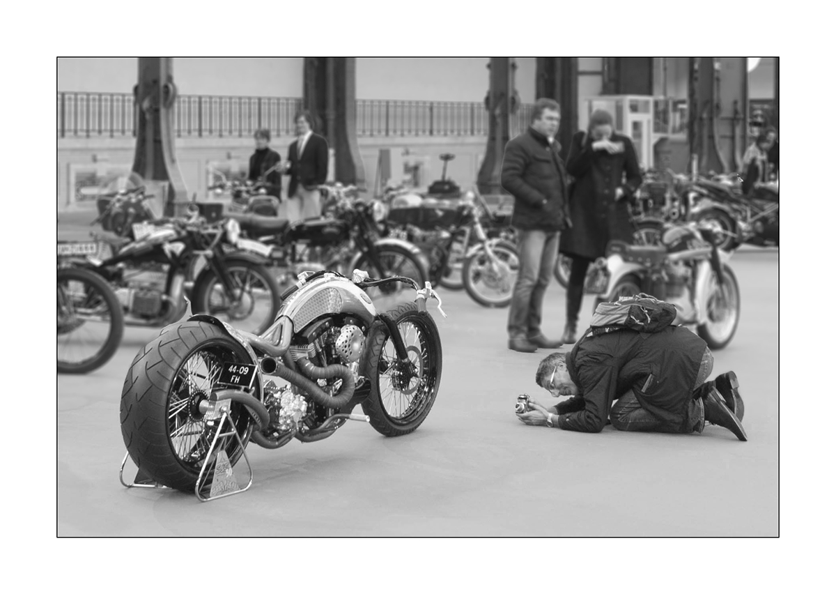 Superbe N&B, superbe moto aussi (moi qui suis souvent insensible aux "charmes" des trucs qui roulent, je suis séduit...), et la scène permet de sortir des classiques clichés d'expositions de "mécaniques" tout en nous faisant découvrir l'engin et l'exposition.