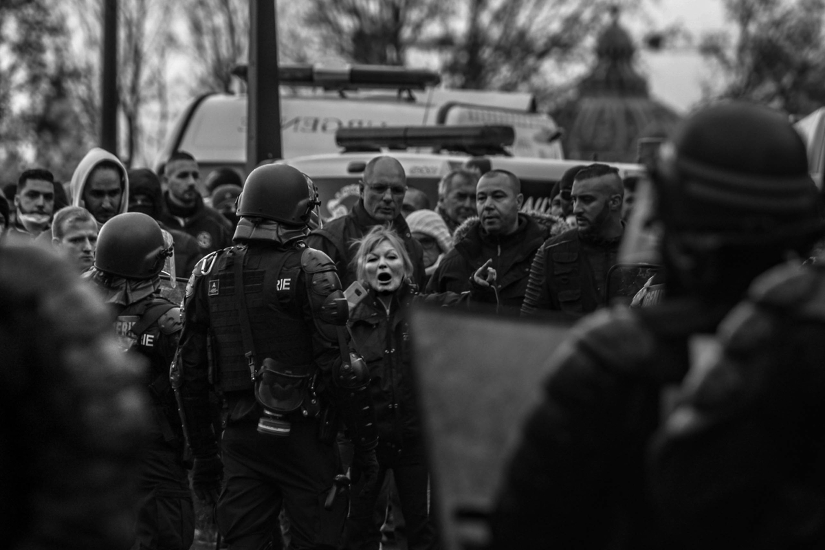 La scène est bien captée, cette femme qui semble seule à s'exprimer face à la gendarmerie et au sein de son groupe méritait la photo...