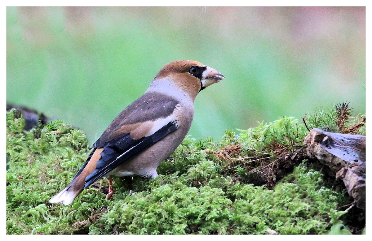 Il faisait -3°, il est enfin arrivé le Grosbec casse- noyaux. Toujours aussi beau. Rare de le voir au sol, sauf quand il manque de nourriture. Alors ce samedi il s'est mêlé aux autres oiseaux..Sa préférence va aux graines protégées par une enveloppe coriace.Il a apprécié le beurre d'arachides .... il s'en est mis plein les babiches...