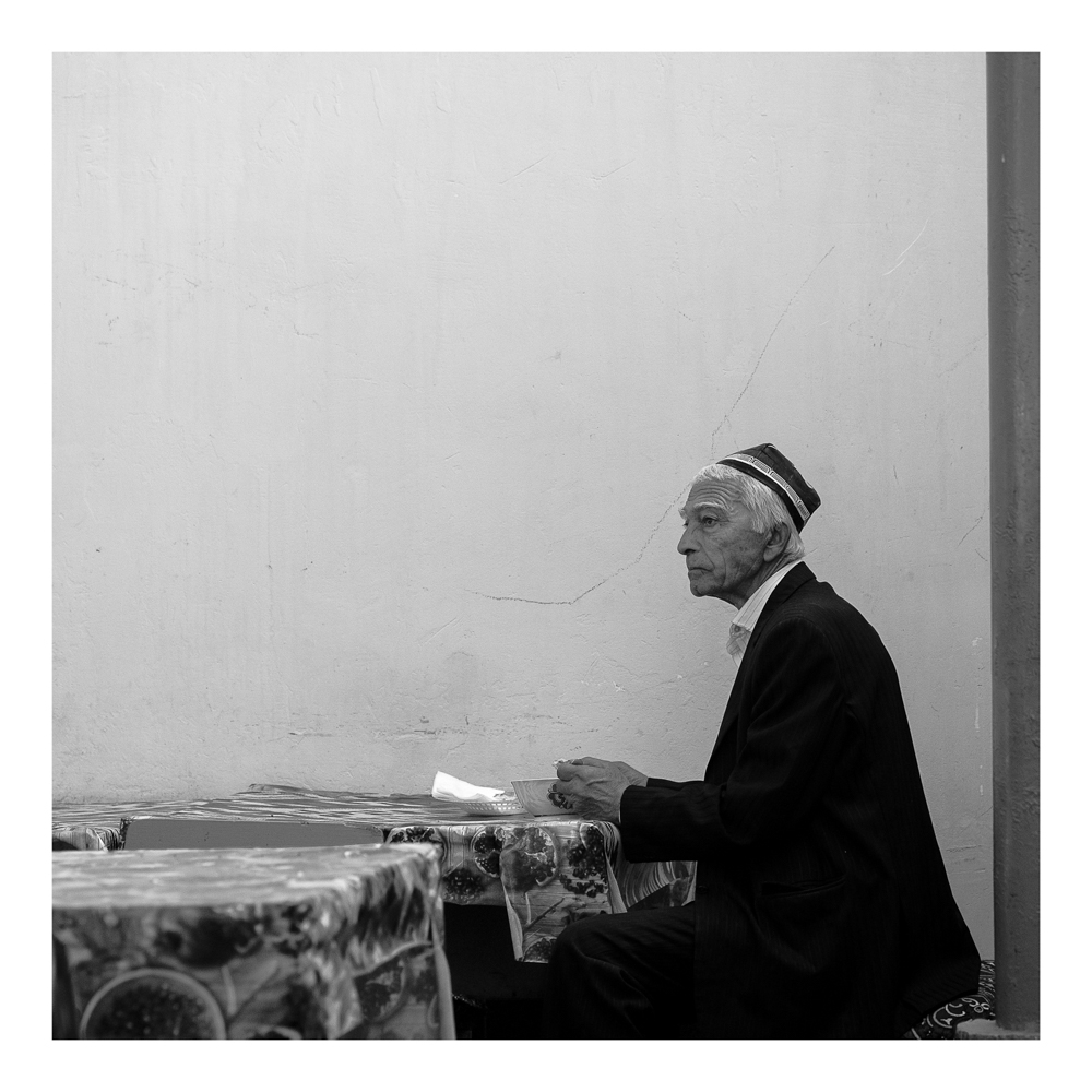 La succession des angles droits (tables et pilier,la jambe et le corps, Le bras, la mâchoire) font de cette photo une rigidité affirmée. L'Homme grand et sec s'impose par une douce froideur silencieuse. La blancheur du mur quelque peu lézardé semble absorber sa profonde réflexion. Notre œil reste fixé à son regard pour peu à peu pénétrer dans son intimité.