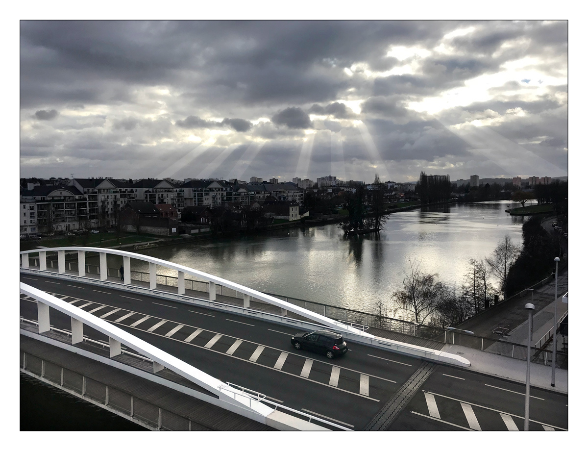 Les rais du soleil avec les rayures de la route et la structure du pont