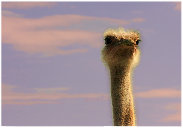 beau moment tendresse pour le petit avec sa môman, cadrage original sans tête mais ça va très bien, ça permet de focaliser sur l'émotion; et là, angle d'attaque super pour une autruche qu'a pas l'air commode, oeil noir et sourire pincé.
