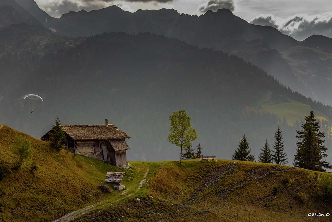 L'arrière-plan un peu terne détourne le regard de ce magnifique chalet d'alpage.