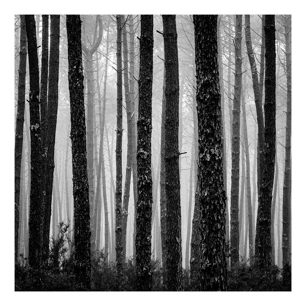 Beau contraste noir et blanc entre ces troncs et la brume qui serpente entre eux.